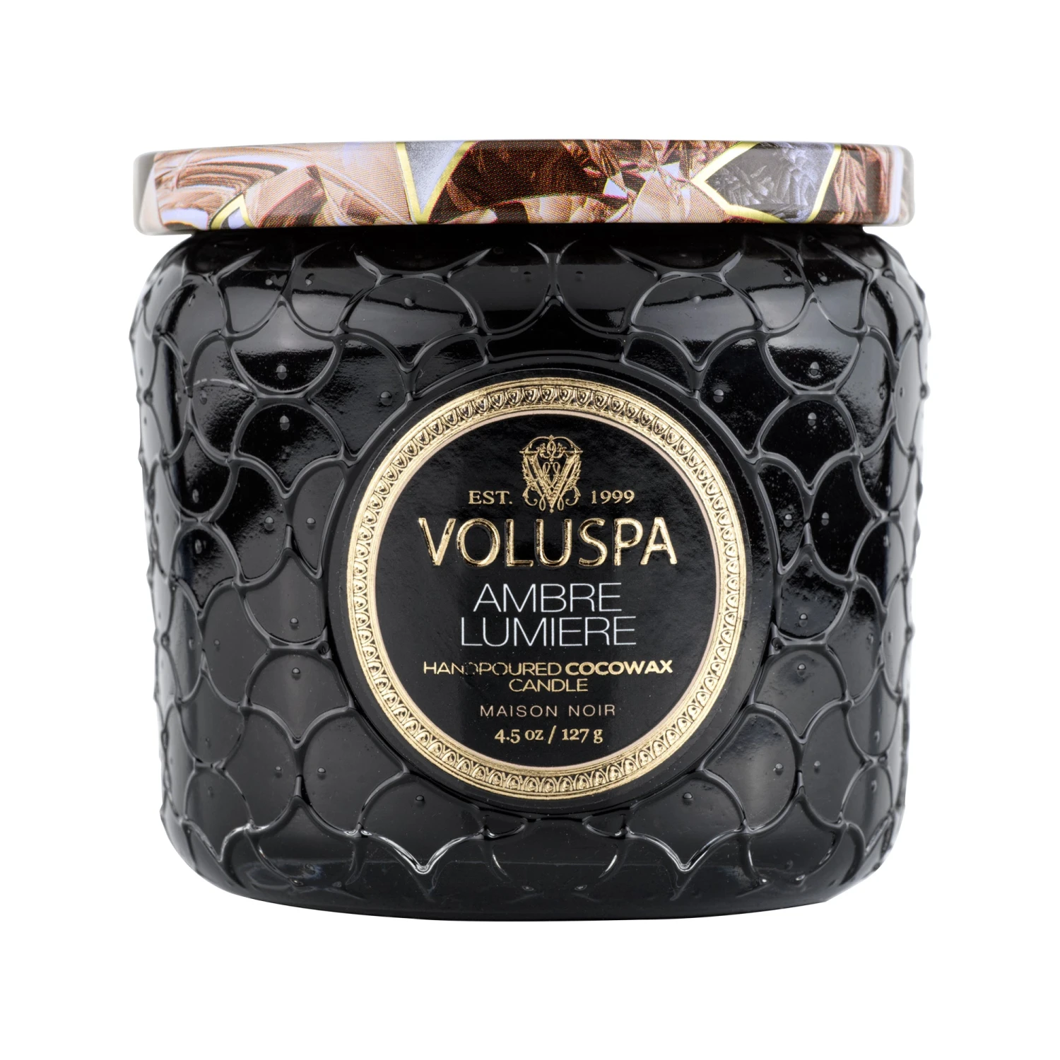A surprising hint of decor for any space, the Petite Jar Candle is small yet eye-catching with glass embossed in the Maison Collection pattern. A metallic decorative lid can be used to extinguish the flame or keep the candle dust-free when not in use. This candle makes the perfect travel companion or thoughtful gift.
